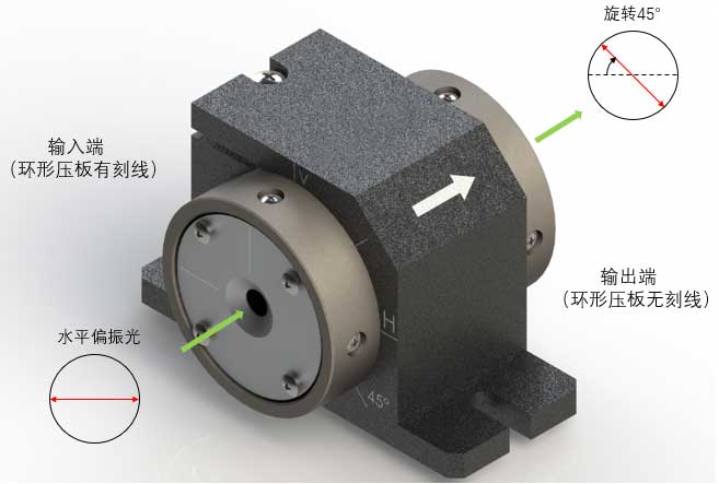 在設計波長和設計溫度下,線偏振光從輸入端入射旋光器,輸出光的偏振方向相對輸入光將旋轉45°,旋轉方向如圖2所示,圖中以水平偏振光為例。旋光方向只與旋光器內部磁場相關,與光傳播方向無關,即具有非互易性。